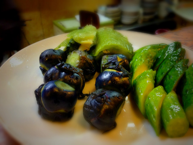 お客様用にお願いした夜、なんと丸ナスと一緒に「青菜漬け」が出てきました。夏もきゅうりは最高ですな。ナスときゅうりがあればなんでもできる!!