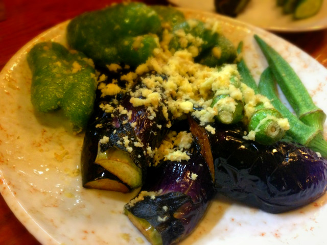 夏といえば、やっぱりナス。無類のナス好きの私には、この揚げたナスをしょうが醤油で、口の中がザブザブという具合に食べるのが最高なのです。さすがマスター、分かってるぅ。最高!!