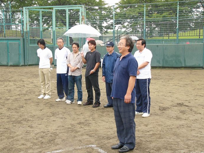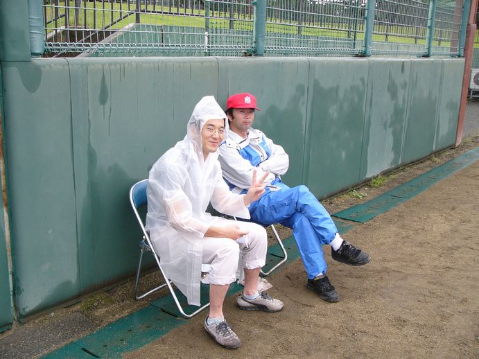 100均(?)レインコートを着ているのが山形の高級料亭NのN氏。赤い糸車の野球帽子をかぶっている火消しのAさん、雨にも打たれづよい二人です。本領発揮!!