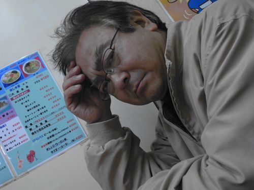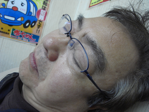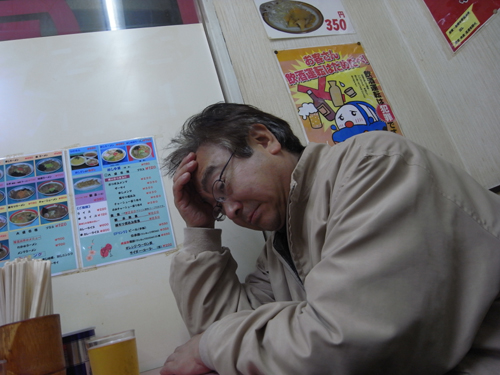お約束の「修ちゃんラーメン」。今回はM田親子さん(Ymiさんと、Arsちゃん)が洗い物を手伝いに来てくれたので、私と4名できました。寝むそうなマスターです。