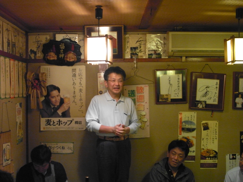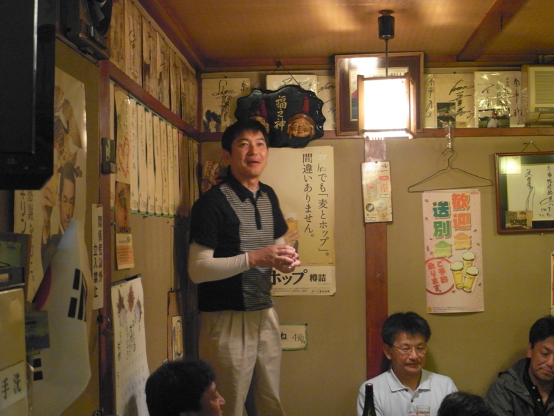 皆さん想い想いのホールをアウトして、表彰式・反省会はいつものとおりマスターの糸車さんで。実行委員長の工場長がご挨拶。往復、とにかくおもしゃいっけ。お世話になりましたあ。