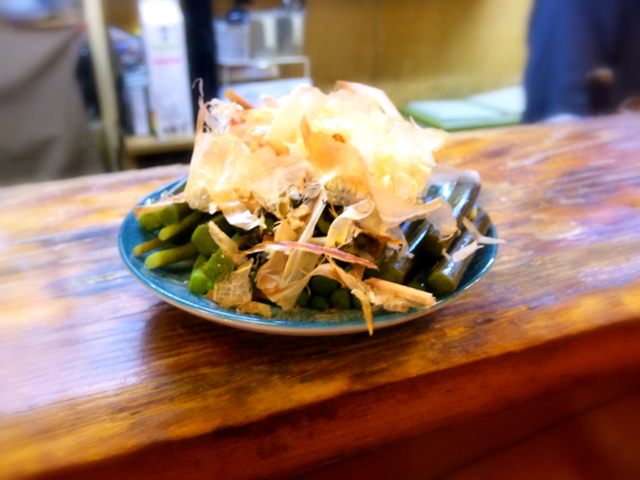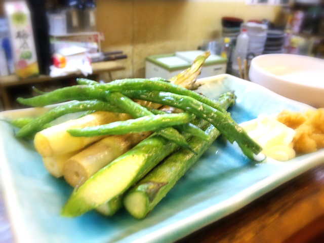 6月初めごろなので、「笹竹」と「アスパラ」の素揚げ。と「ささぎ」