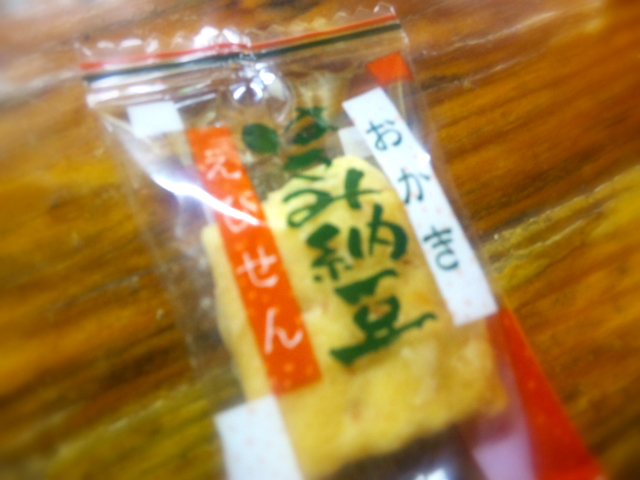 Y子ちんがもらってきた、珍しい「納豆おかき」。ドライでビターな納豆がはさんであるなかなかのおかきでした。