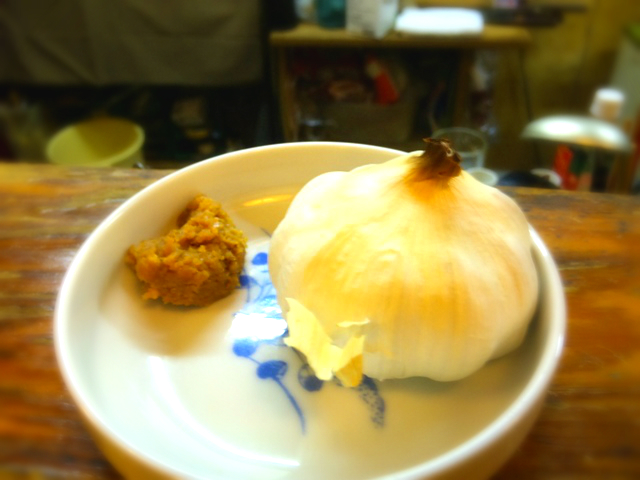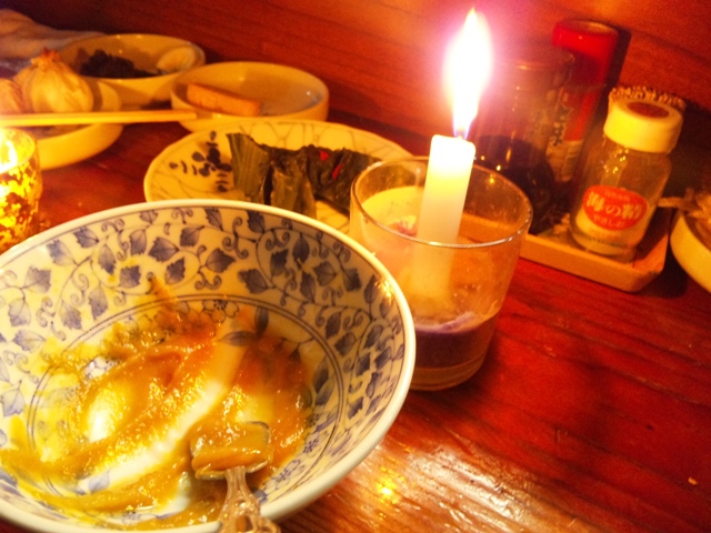 鳥羽二郎さんが、ろうそくに火を灯し、ちょしていたら、マスターが「味噌」を出してきてくれました。木へらに付けて焼いてみ(食べ)ました。
