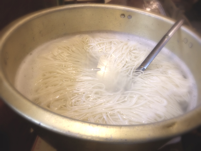 しめの「ひっぱりそうめん」。納豆と生醤油で、釜あげみたいにして。