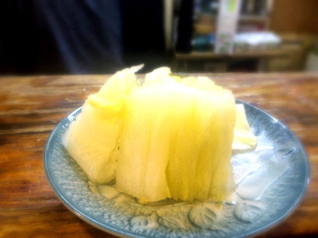 白菜漬け。最初、お浸しかと思って、醤油をたらして食べてしまいました。みずみずしかったので。