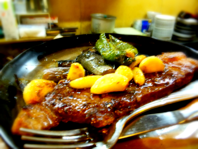 出ましたっ!!「ステーキっ」。付け合わせがピーマンと茄子、久しぶりに茄子食べました。ステーキのソースも美味かったです。