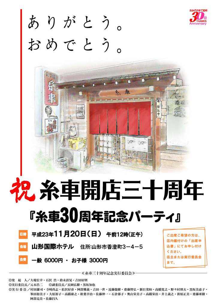 糸車さんの30周年パーティまで、一ヶ月をきりました(楽しみ、)。実行委員長からの連絡では、今週(10/22まで)がご出席者確認の締め切りです。みなさんお忘れなきようお願いします。