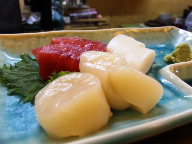 写真は、たぶん2月の中頃、ホタテとマグロのお刺身。見た目にも柔らかさと活きの良さがわかりますね。