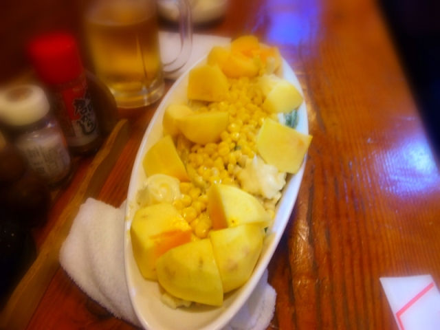 んで、写真ではちょっとわかりにくいんですが、「柿の舟盛り」。(んなの無いのです)実のなる、柿です。サラダ?、ん?、何?(いーんだよ!!ってマスターが。。)