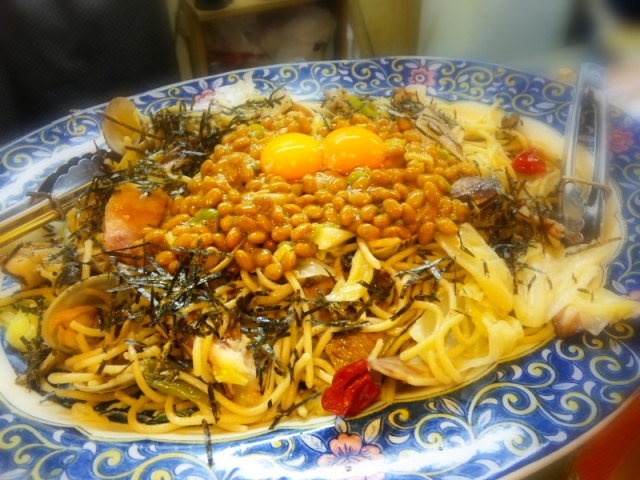 じょわ~んっ!!「超特大・アサリの和風パスタ納豆玉子風味」。風味っていうかそのまま納豆です。ボンゴレビアナットゥ!!みたいな。お店では一番大きい皿になるのかな、超特大です。一人前。(ウソです。ごめんなさい。希望です。)「マスターの気まぐれパスタ」とかPOPつくっちゃおうかな。うまいっすもー。
