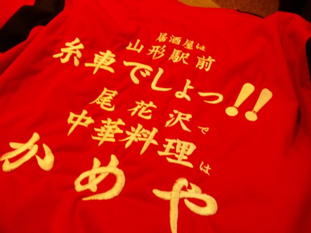 赤の刺しゅうは、尾花沢にある「かめや」さんと山形の「糸車」の看板を背負ったコラボブレーカー、“コラブレ”です。道場七二郎さんのオリジナルグッズです。(詳しいい製作秘話はこちら=道場七二郎さんのブログ)