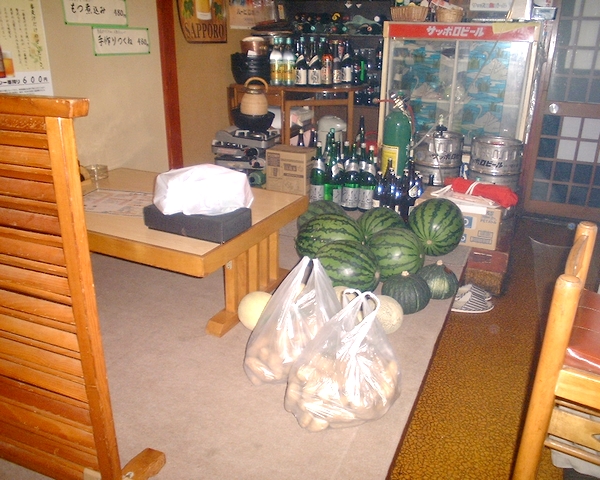 道場さんのふるさと土産ですね。スイカ、かぼちゃ、そして大量のじゃがいも達。「じゃがいもの店・糸車」というお店のフレーズの発祥は、道場さんのじゃがいもだと以前にお聞きしていました。これが、その尾花沢産じゃがいもですね。