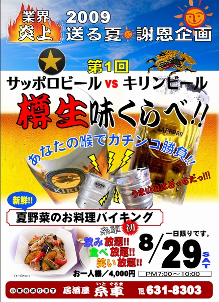 8月の最後の週末、行く夏をしのんで、また感謝企画、繁盛貢献企画として「サッポロビールvsキリンビール 樽生味くらべ と夏野菜のお料理バイキング」というイベントを開催するそうです。