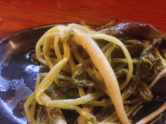 大根ぱ(葉)のおろぬきとナス干しの煮物。大根の根っこもまるごとです。さすがマスターです。