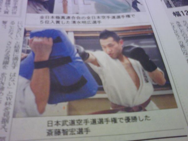 で、娘さんのご主人です。先日も書きましたが「空手日本一!!」ですよー。凄いです。本当に新聞に掲載されましたぁ。良かったです。改めておめでとうございました。しかし、この日、妻である娘さんは掲載紙を見ていません。お友達からメールで載ったことを知らされたらしく、コンビニから新聞を買ってきたのでしたが、この日の新聞かどうかまでは情報になく・・・。でも、いい話です。