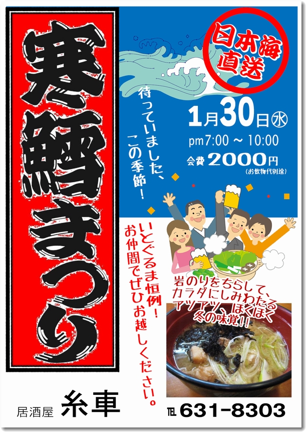 糸車さんの寒鱈まつりも大盛況!! 満員御礼でにぎやかな楽しい一夜でした。小グループが、5団体?、マスターも、ヘルプの姫ちゃんも大忙しでしたね。