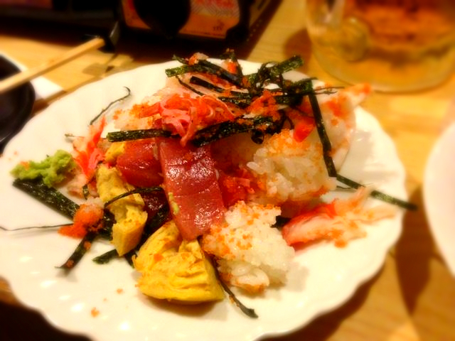 盛り上がっているところへ、マスターがお手製のちらし寿司をもってきてくれました。「おーっ!!」