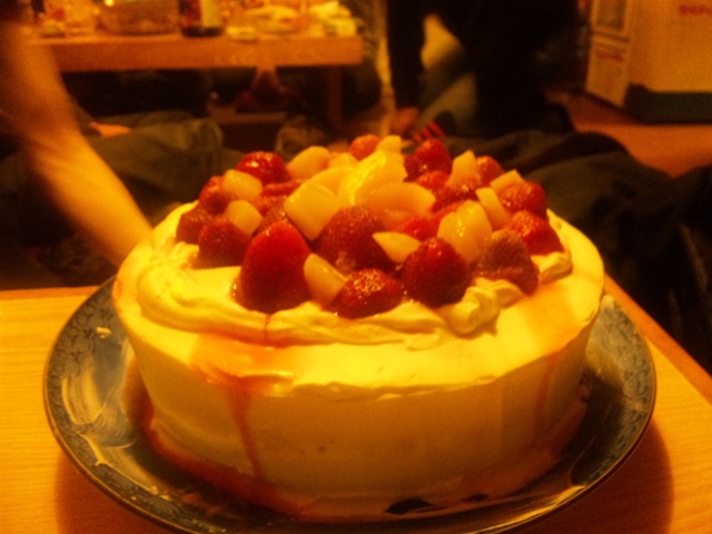 糸車さんで誕生会、ooYさんのバースデーケーキ。マスターの手づくりです。