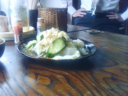 少しして、今度は「きゅうりと白菜のつけもの薄醤油だれ汁かけ」みたいな漬物が四人分どうぞって的に。これも美味しかったです。